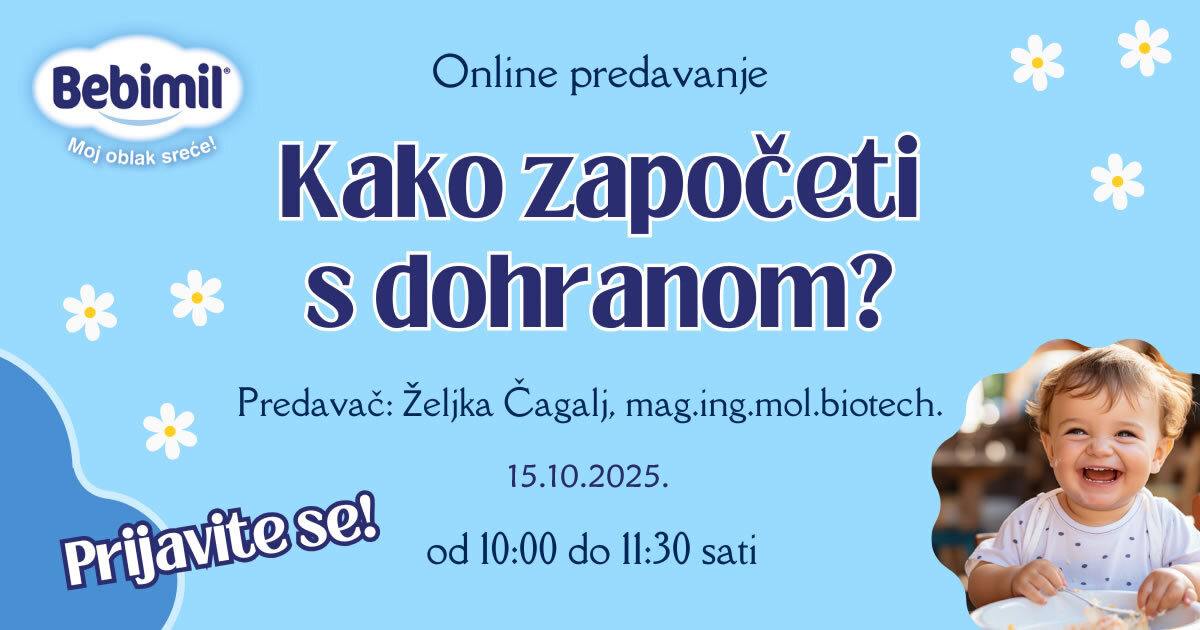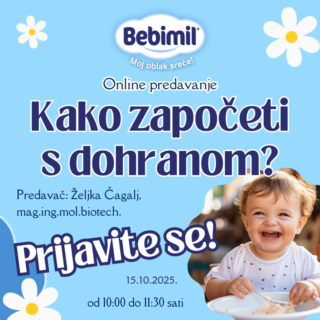 Približava se još jedno Bebimil online predavanje! U ovom posebnom izdanju našeg online savjetovanja, želimo pomoći roditeljima u uvođenju novih namirnica u bebinu dohranu. Tijekom predavanja bavit ćemo se najčešćim pitanjima i nedoumicama, kao što su: